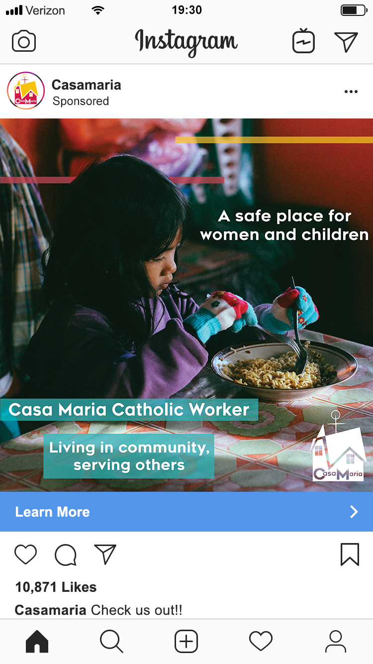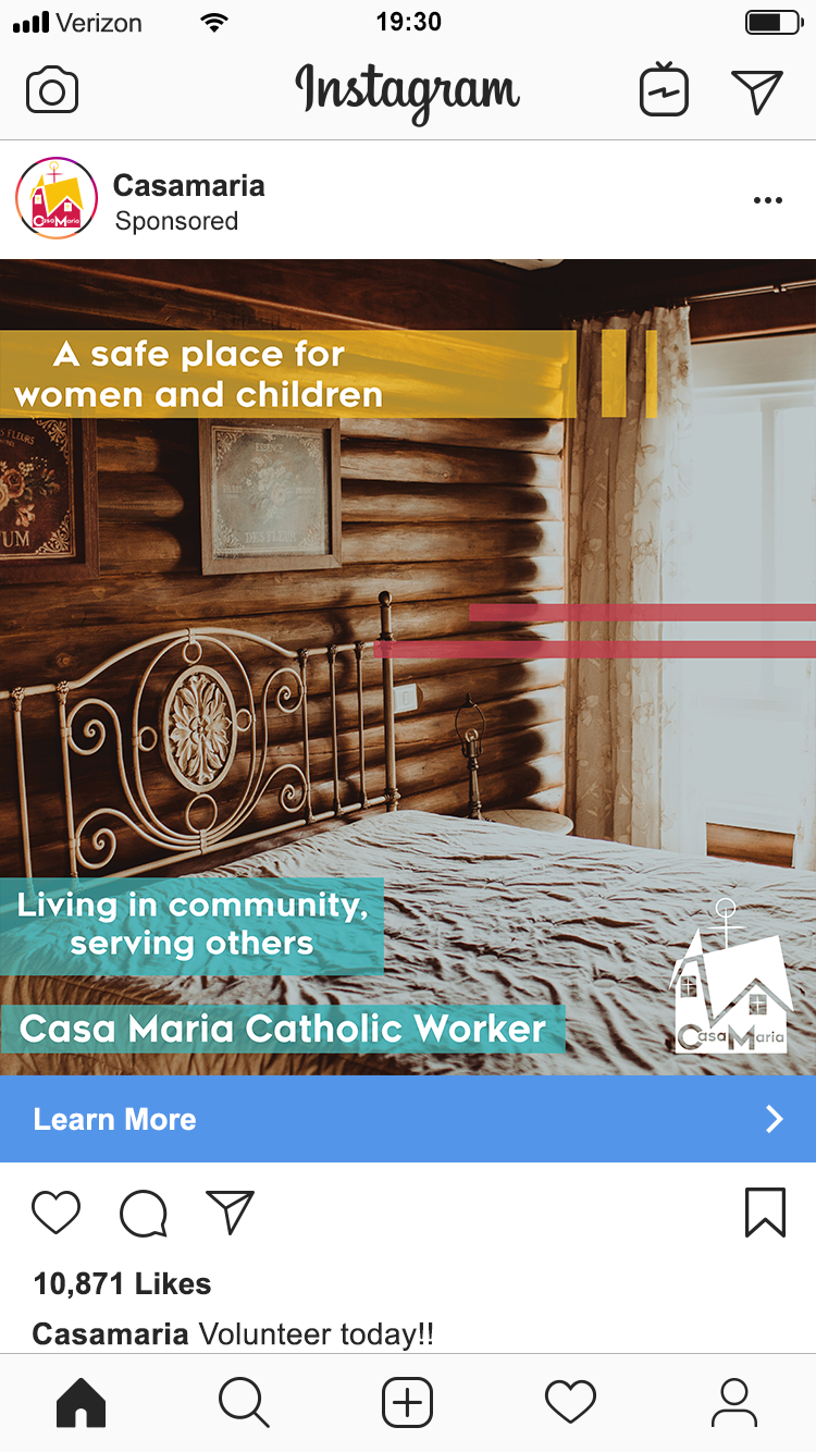 I created social media advertisements for Casa Maria Catholic Worker Society which is a home that helps provide shelter for women and children that are in need. I used imagery mixed with simple overlays of their brand colors to create two advertisements.